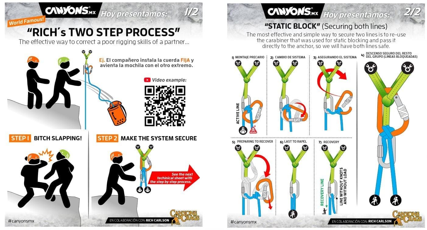 What started as a tongue-in-cheek comment in one of my YouTube videos has become part of the canyoneering lexicon. "Rich's Two-Step Process" is simple: Step 1 – Get their attention (affectionately known as the "bitch slap"). Step 2 – Make the system secure. The idea? Sometimes you need to interrupt dangerous behavior before you can teach the right technique. You can't deliver a safety lesson to someone who isn't listening, and nothing gets attention quite like a metaphorical wake-up call.